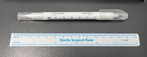 Caneta estéril para marcação de pele, desenvolvida para procedimentos médicos, estéticos e odontológicos. Proporciona traços precisos, resistentes à limpeza pré-operatória, permitindo delimitação segura e confiável.