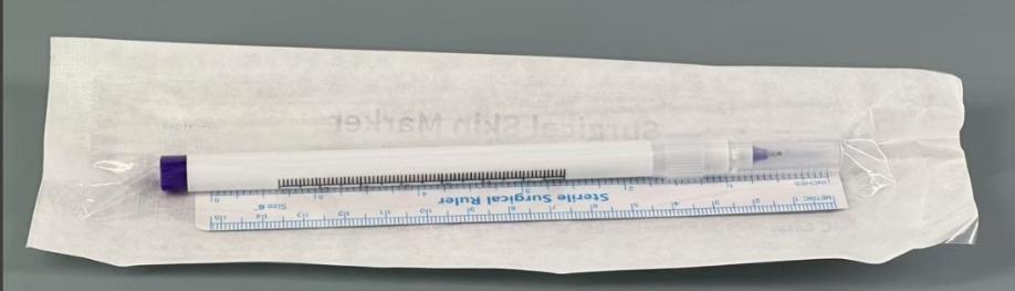 Caneta estéril para marcação de pele, desenvolvida para procedimentos médicos, estéticos e odontológicos. Proporciona traços precisos, resistentes à limpeza pré-operatória, permitindo delimitação segura e confiável.
